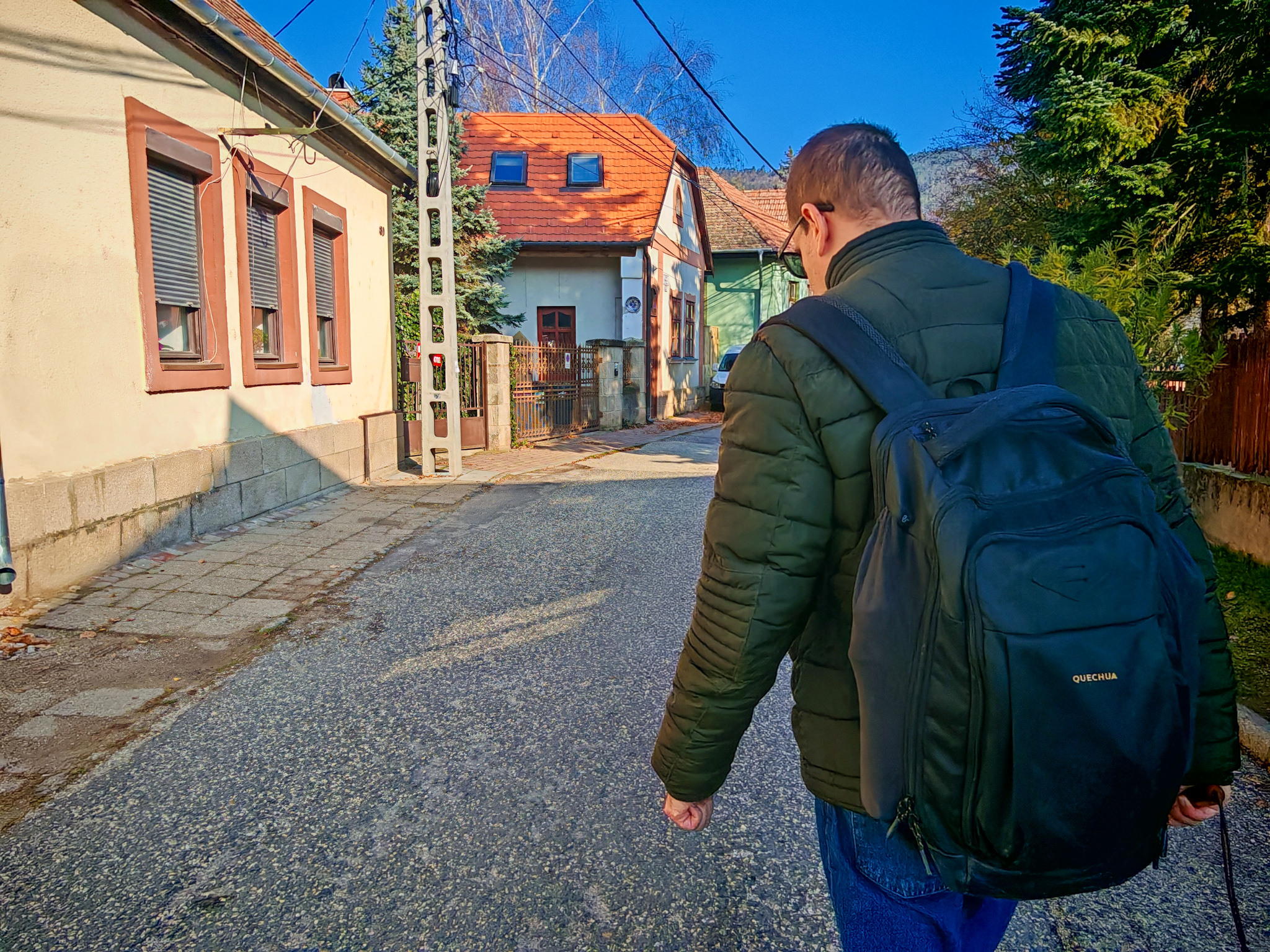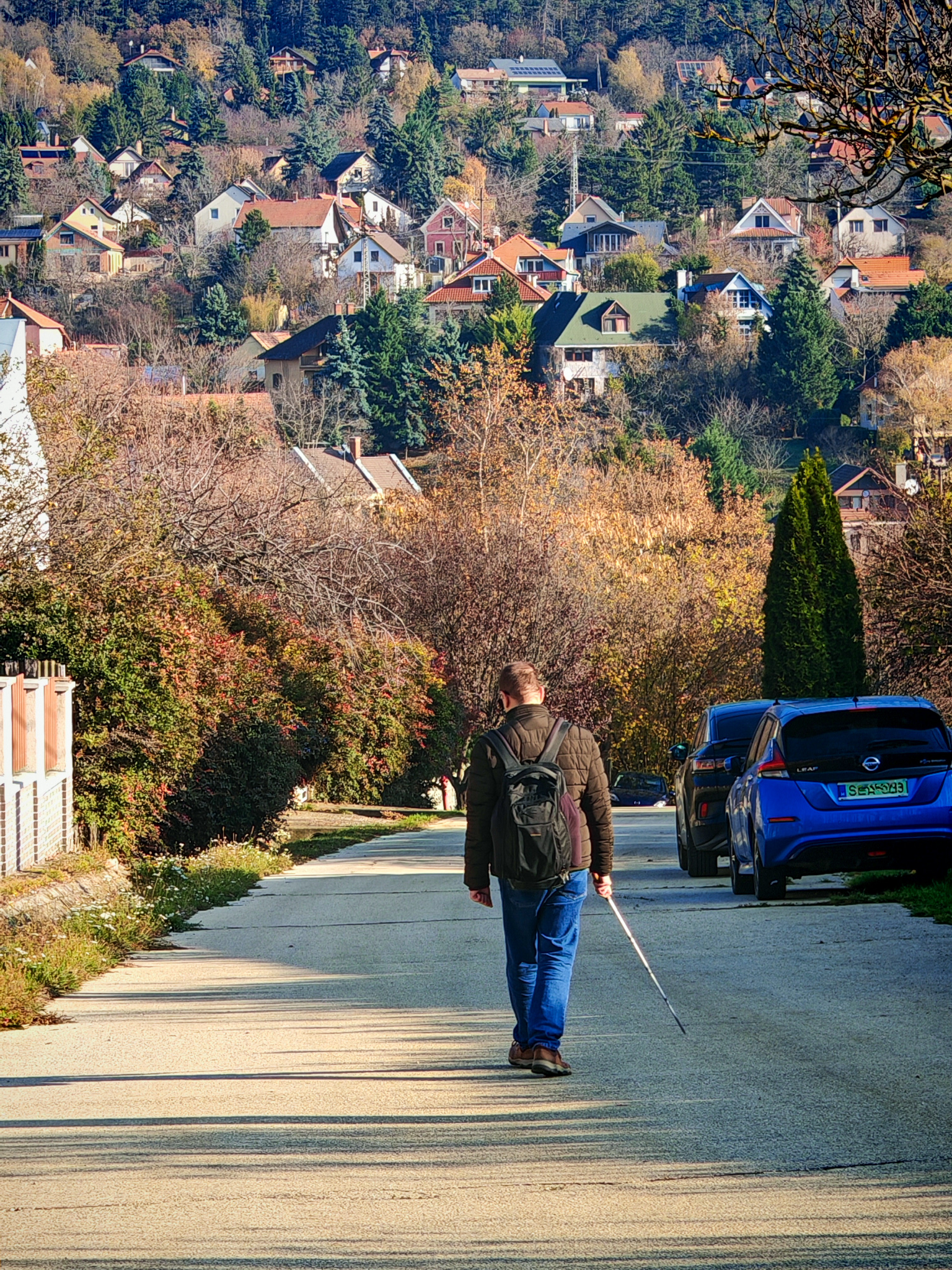 Közlekedése logikusan felépített rendszerre épül. „Azt nézem, hogy itt egy sarok, ott egy beugró, itt két kereszteződés van. Így jegyzem meg az útvonalakat.” A faluban a támpontokat követve közlekedik, a városi vezetősávokat nem hiányolja. „Nem baj, hogy itt nincs vezetősáv. A családtagjaim és a közlekedéstanárom tanították meg az útvonalakat.” A buszforduló, templom, bolt, gyógytornász, posta és pékség: ezek a célpontjai helyben. „A Bodza utca meredekebb, de rövidebb és egyértelműbb, mint a játszótér felé menni.” Nem tartja különösebben veszélyesnek a falu utcáit. „Szerintem ugyanúgy figyelnek rám itt is, mint a városban.”