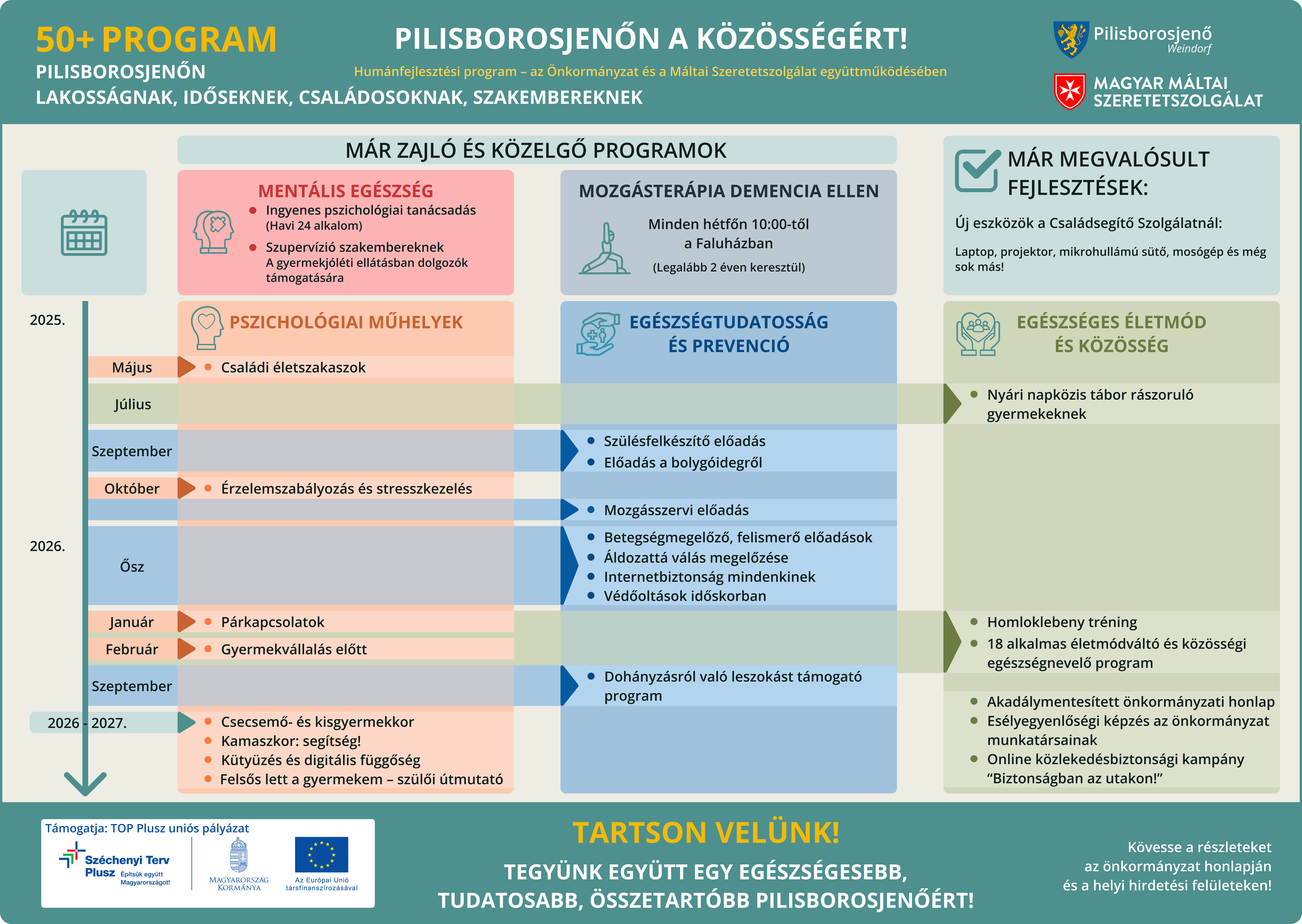Folytatódik a Pilisborosjenői Önkormányzat és a Magyar Máltai Szeretetszolgálat közös „Humán fejlesztések” programsorozata, amelynek célja a helyi közösség támogatása a mentális és fizikai egészség terén. Az alábbi programok várják a lakosokat a következő hónapokban a Faluházban: