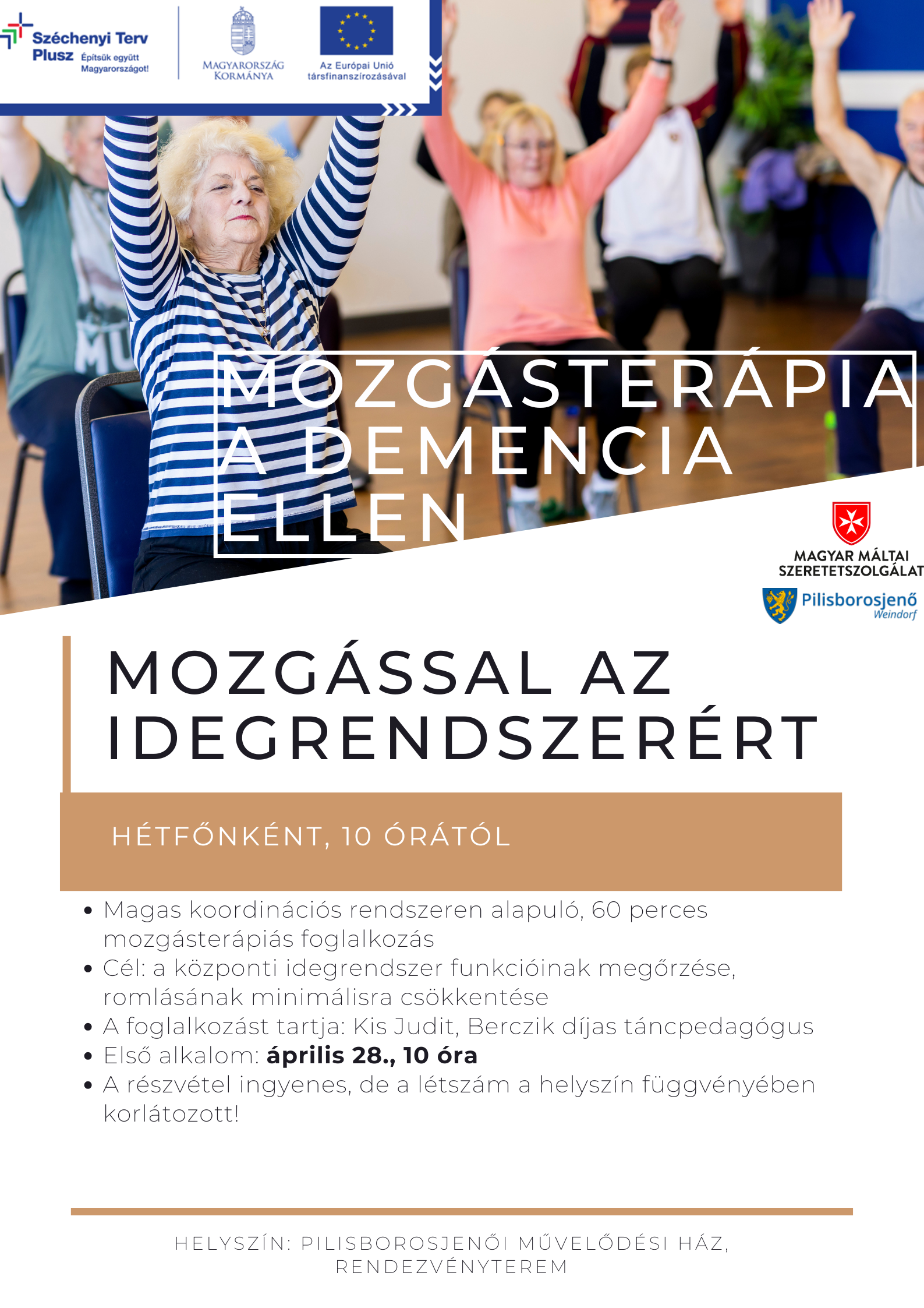 Minden hétfőn 10 órától mozgásterápiás foglalkozás indul időseknek, amelynek célja a központi idegrendszer funkcióinak megőrzése, romlásának minimálisra csökkentése.