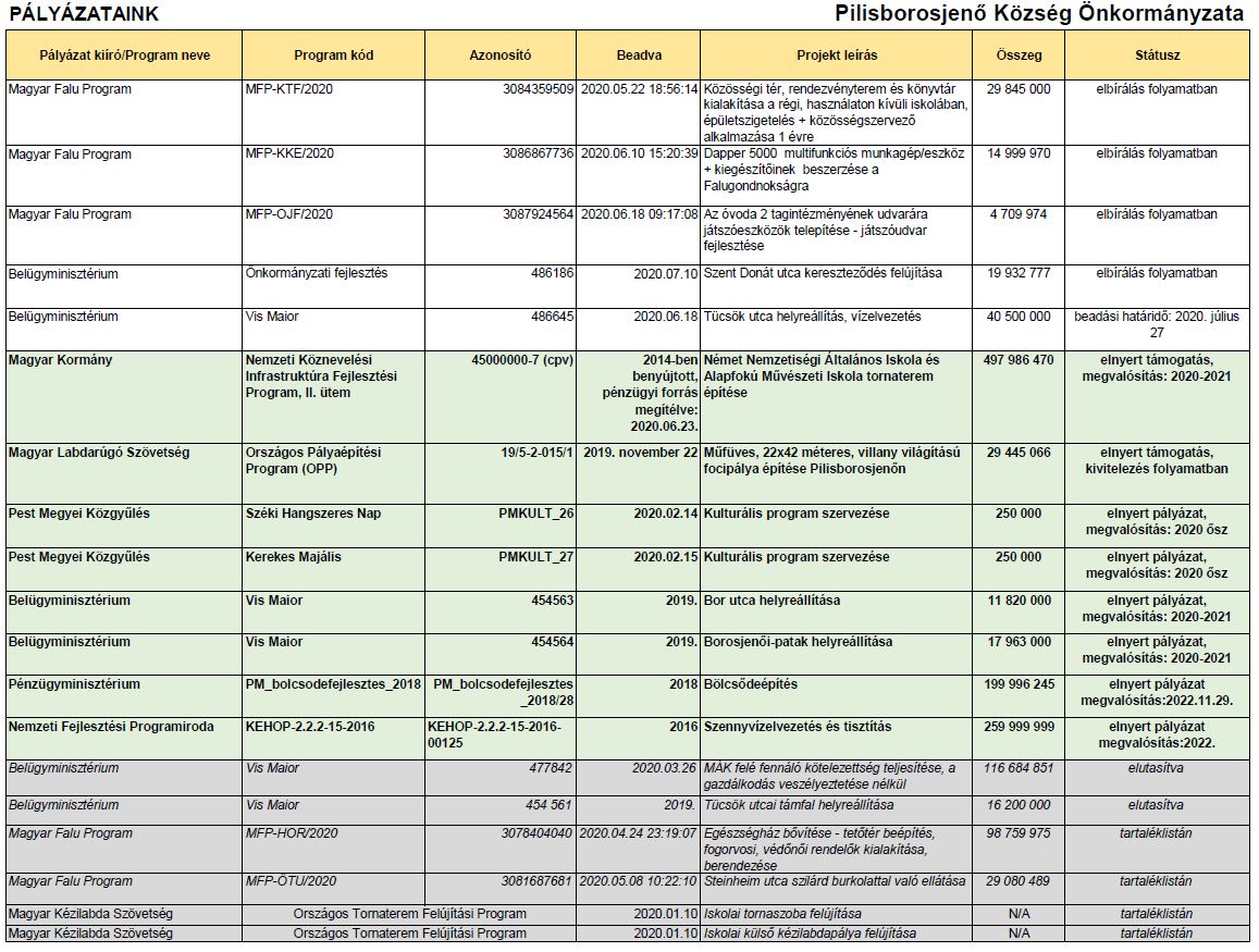 Egy közérthető táblázatban foglaltuk össze benyújtott pályázatainkat.
