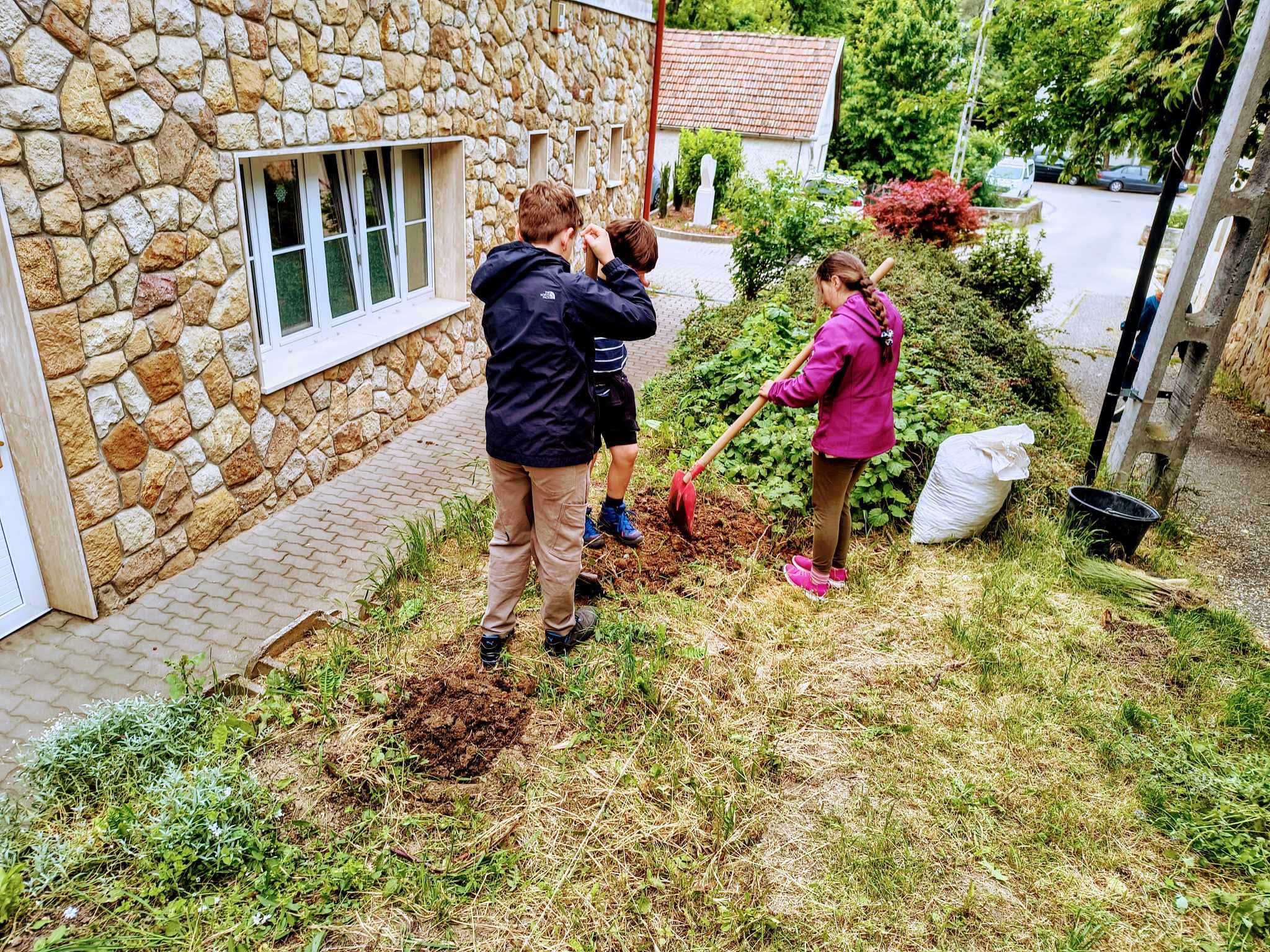 A Szent Márton Waldorf Iskola diákjai kedvet kaptak a Nyugdíjas Klub tagjaitól ahhoz, hogy hozzájáruljanak a falu szépítéséhez. Május végén a Reitter pince előtti teret gazolták ki és ültettek oda ligeti növényeket. (Fotó: Marczis Dávid)