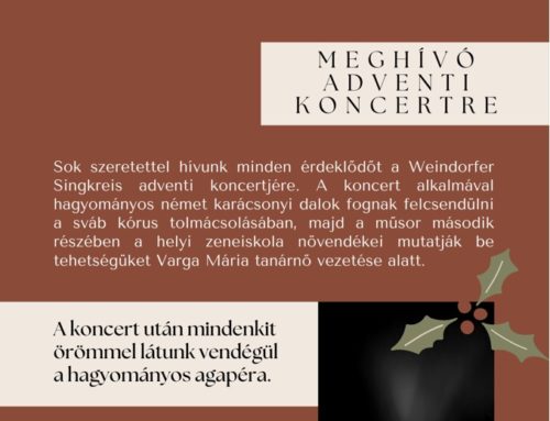 Advent 3. vasárnapján, az esti mise után csodálatos koncerten vehettünk részt, a budakalászi Lustige Schwaben kórus jóvoltából. Meghívott vendégként, a Weindorfer Singkreis / Weindorfer Schwaben – Pilisborosjenői Svábok lépett fel. A koncert után a kalászi sváb közösség forralt borral, teával és házi készítésű süteménnyel várta a látogatókat, igazi karácsonyi hangulatot varázsolva a templomkertbe.