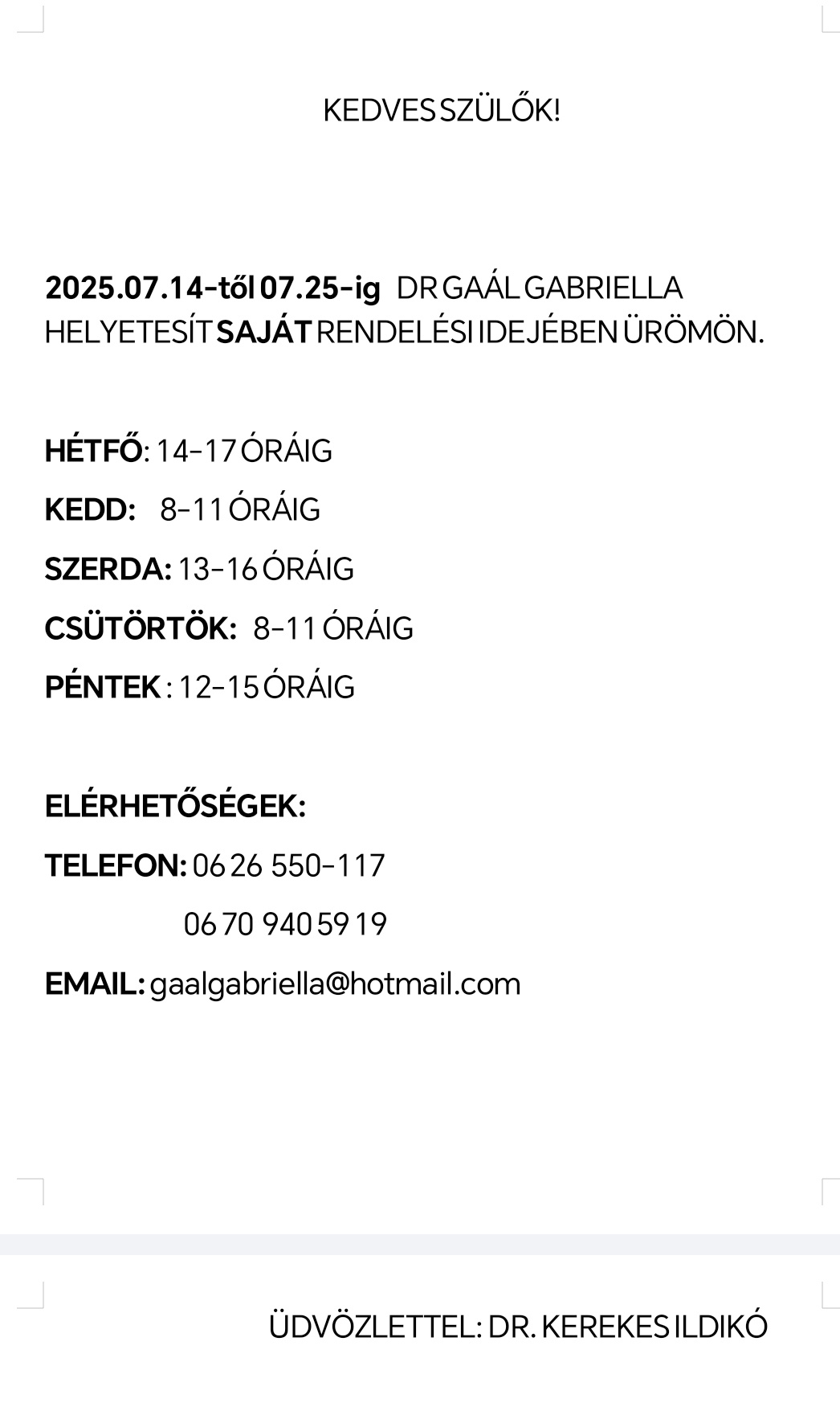 Gyermek háziorvosi rendelőSzecsányi László2025-09-05T12:02:15+02:00 Gyermek háziorvosi rendelő Pilisborosjenő, Fő út 16. +3626536033 +3626550097 Dr. Kerekes Ildikó Nyitvatartás: Bejelentkezés rendelési időben. Megosztás FacebookXRedditLinkedInWhatsAppTumblrPinterestEmail: